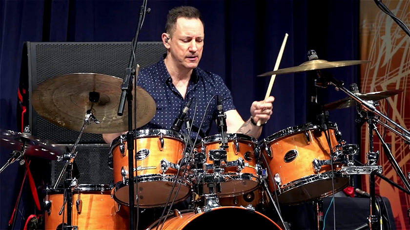 His main kit is a Sonor SQ2 Vintage Maple Custom Finish set.