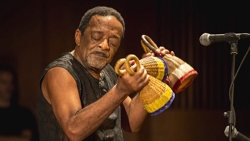 After playing in every imaginable context from symphonic orchestras to street bands in his hometown, Nana moved to Rio de Janeiro and began to play with one of Brazil’s greatest singers, Milton Nascimento. In 1970 the Argentinian tenor player Gato Barbieri was in Rio and invited Nana to join his band. They played in New York and then toured Europe, starting at the Montreux Jazz Festival where Nana caused a sensation. When the tour finished Nana decided to stay in Paris. During his time in the city he made his first recording, Africa Deus. Nana returned to Brazil and began a collaboration with guitarist Egberto Gismonti that lasted for eight years and produced three albums of duets. Back in New York he formed Codona with Don Cherry and Collin Walcott, as well as touring and recording with Pat Metheny’s band. Since 1975 Nana has recorded with everyone from B.B. King to Jean Luc Ponty to the Talking Heads, but has never allowed himself to become a studio musician. His contributions to each project are special and go beyond the usual role allotted a percussionist.